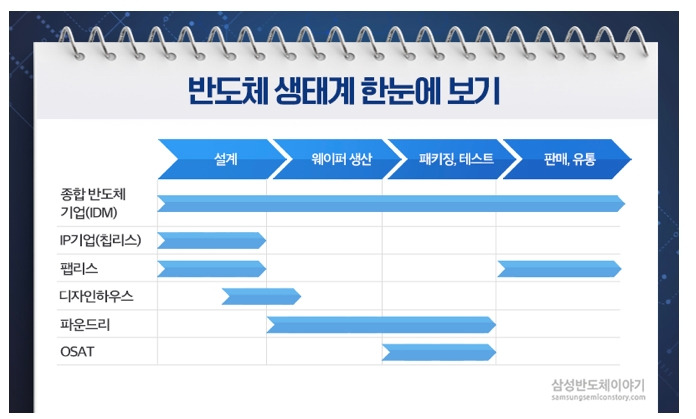 여기서 용어 정리를 간략히 하자면, “팹리스란, 반도체 생산에 필요한 공장은 두지 않고 설계와 개발만 추진하는 기업이다. 대표적으로 모바일 SoC칩을 만드는 퀄컴과 브로드컴, GPU를 개발하는 엔비디아가 있다. 파운드리란 팹리스 반도체 기업에서 맡긴 반도체 설계 생산에 주력하는데, 대만 TSMC나 미국 글로벌 파운드리가 대표적이다.”(출처: IT동아) 그리고 삼성전자나 인텔은 다 하기 때문에 종합 반도체 기업이라 한다.