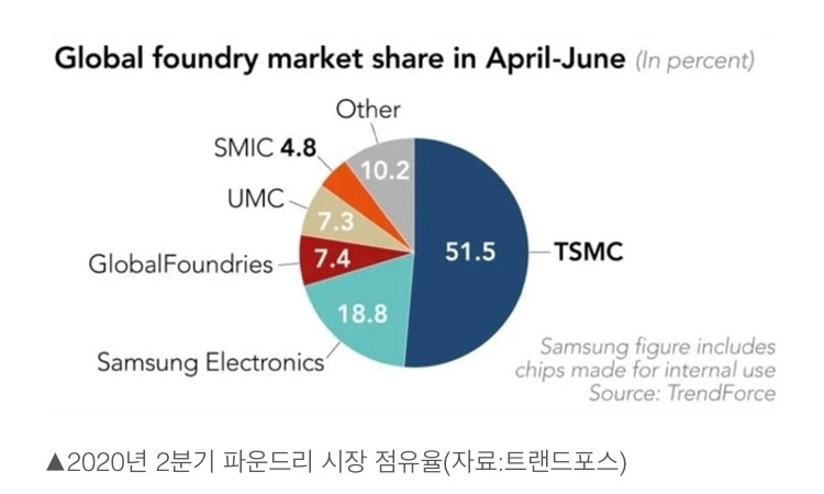 하지만 파운드리에서 50% 전후의 마켓셰어를 유지하고 반도체 업체 중 시가총액 1위인 끝판왕 대만 기업 TSMC는 녹록지 않은 상대이다. “고객과 경쟁하지 않는다” 모토로 TSMC는 위탁생산만 30년 해왔다. 그리고 TSMC는 일본 메모리 회사들이 삼성전자에게 패배한 것을 지켜봤다. TSMC는 삼성전자의 자본과 인력 투입에 같은 방식으로 대응한다. 일례로 2019년에는 13조원 투자 및 3000명 채용을 한다. 게다가 TSMC는 위탁 생산을 오랫동안 해온 노하우와 경험이 있다. 그래서 그런지 같은 7nm 공정이라도 TSMC는 삼성전자 파운드리 사업부보다 기술력, 패키징 등에서 우위를 유지하고 있다. 심지어 TSMC는 얼마 전에는 삼성전자가 아직 제시하지 못한 2nm 공정개발에 착수했다고 한다. 여기서 7nm, 2nm는 반도체 회로의 선폭(線幅)을 말하는데, 미세할수록 같은 크기의 웨이퍼(반도체의 원재료)에서 더 많은 반도체를 생산할 수 있다.