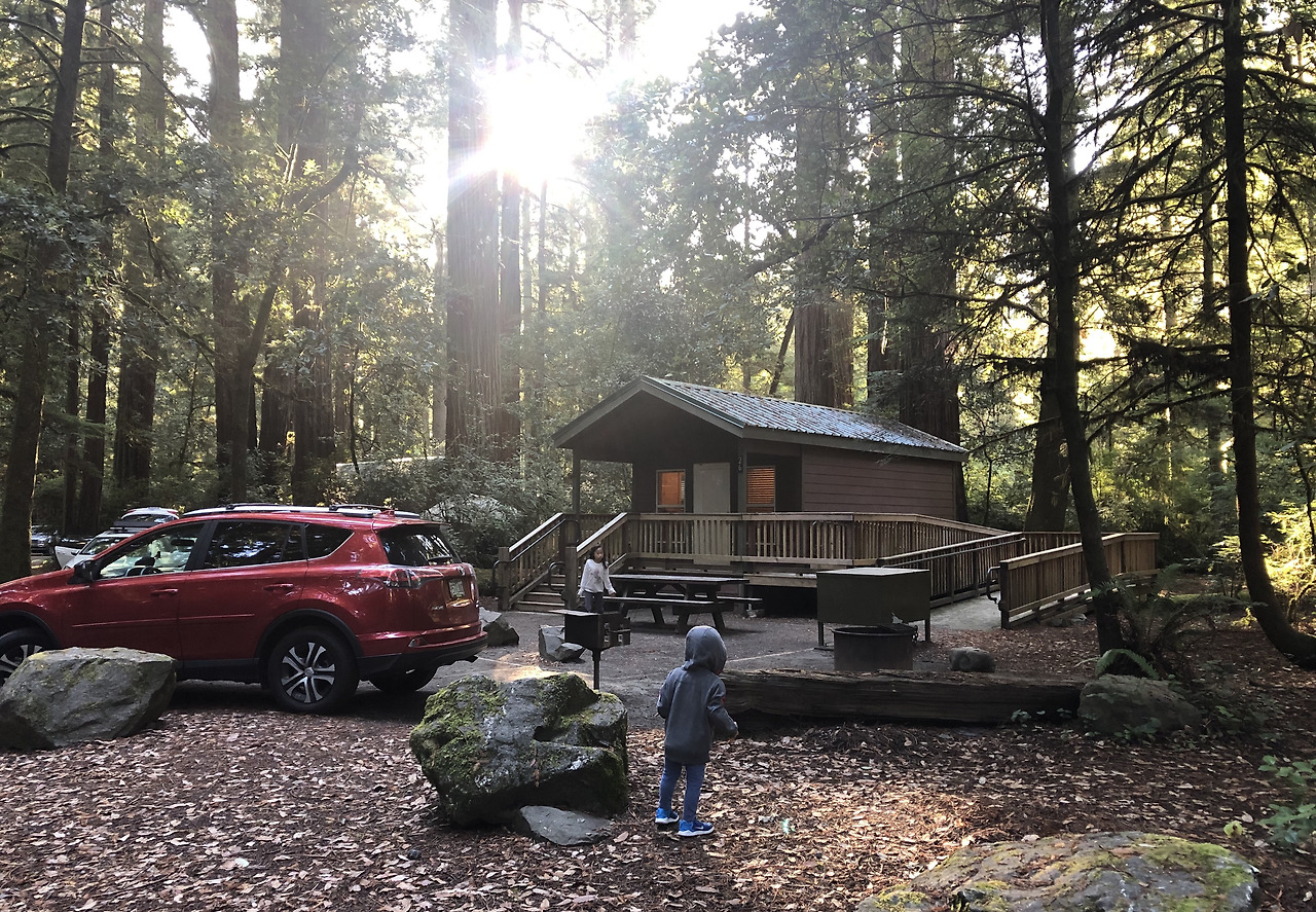 저녁 8시경에 캠핑장에 도착. 사진으로만 본 초거대 삼나무들 치고는 마르고 긴 나무들만 시커멓게 보인다. 살짝 아쉬움이 들었으나 숙소부터 찾아서 저녁 먹는 것이 급선무다. 우린 이미 예약한 지붕 있고 따뜻한 (전기) 난방이 들어오는 일박에 100불하는 오두막집을 헤매다가 겨우 찾았다. 캠핑장은 안내등도 없고 다른 캠핑하는 사람들마저 불을 껐거나 소곤소곤 대화를 하는 바람에 숙소를 찾기가 어려웠다. (이건 너무 자연 친화적 아닌가...)