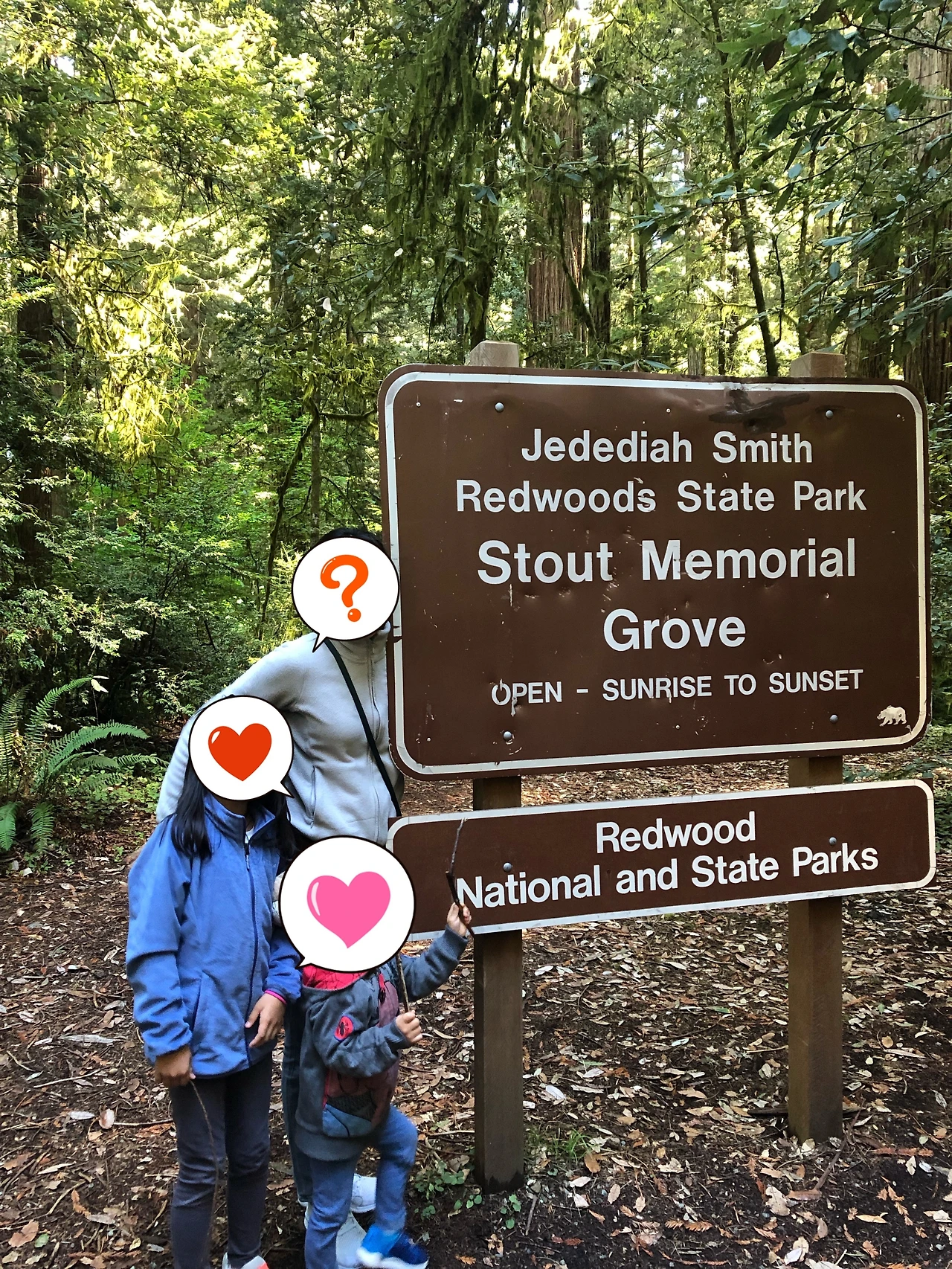 참고로 캘리포니아에는 삼나무가 많은 연방, 주립 공원들이 제법 있다. 제레디아 스미스 공원을 고른 이유는 산책로가 키즈 프랜들리(= 내가 둘째를 업지 않아도 되는 평탄한 길)하며 사진 찍기가 좋다고 한다.