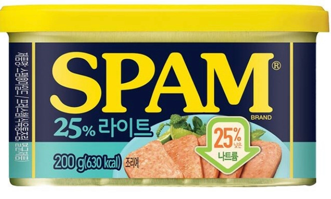 그러다 보니 나는 스팸을 먹을 일이 점차 없어지고 스팸 맛에 대한 기억이 희미해져 갔다. 그러다 몇 년 전 어느 젊은 한 분이 스팸 선물 세트를 들고 지하철을 타는 것을 목격했다. 난 계속해서 흘끔흘끔 선물 세트를 쳐다보다가 아이디어가 번뜩 생각났다. 내가 스팸 선물을 받을 수 없다면 내가 스스로 하나 산다! 역에서 서둘러 내려서 나는 집 앞 마트에 들어가서 오리지널 스팸을 고르려다가... 스팸 라이트를 집었다. 그것도 제일 작은 사이즈로. 25프로 저염 스팸이면서 작은 걸 사 가지고 가면 난 적어도 아내한테 할 말이 있다고 생각했다.