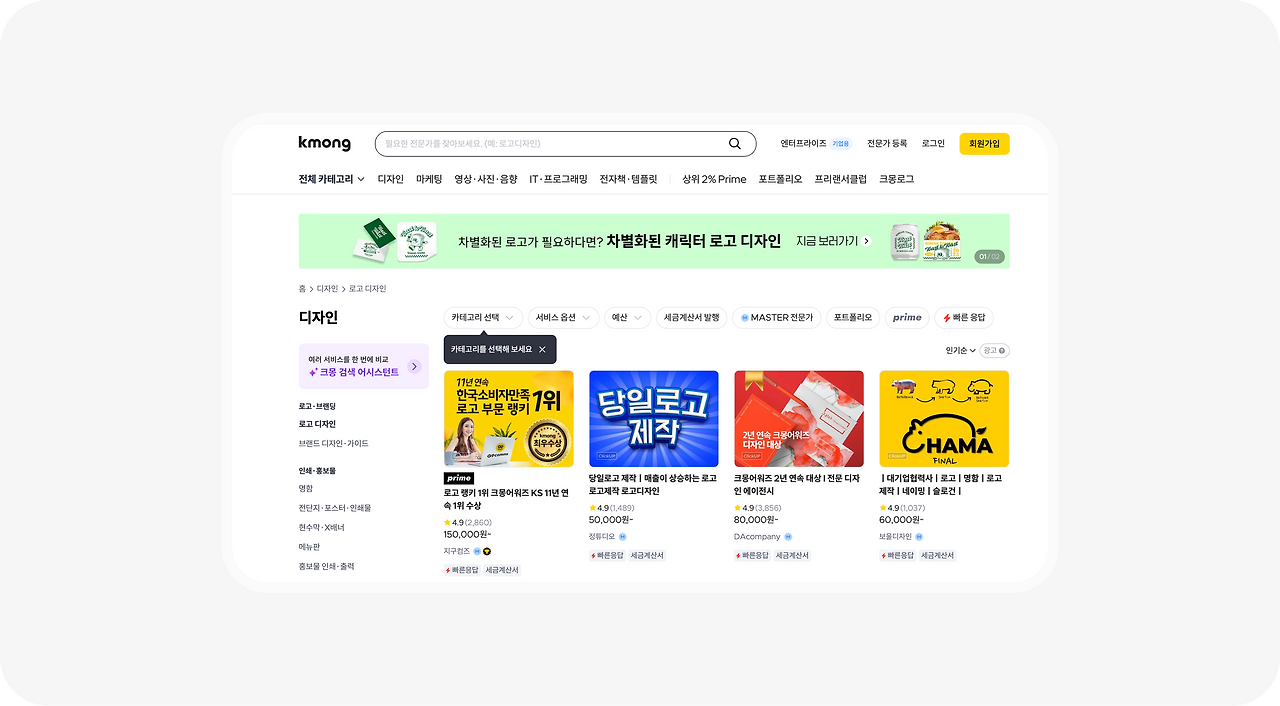 만약 인스타그램 검색이 번거롭다면 의뢰인 입장에서 크몽은 아주 좋은 플랫폼이 될 수 있습니다. 사실 디자이너들 사이에서는 수수료와 가격 경쟁 때문에 크몽에 대한 여론이 좋지 않은 편입니다. 하지만 마치 쇼핑하듯 서비스를 쉽게 살펴보고 구매할 수 있기 때문에 의뢰하시는 분들께는 더할 나위 없이 편한 플랫폼이 될 수 있어요.