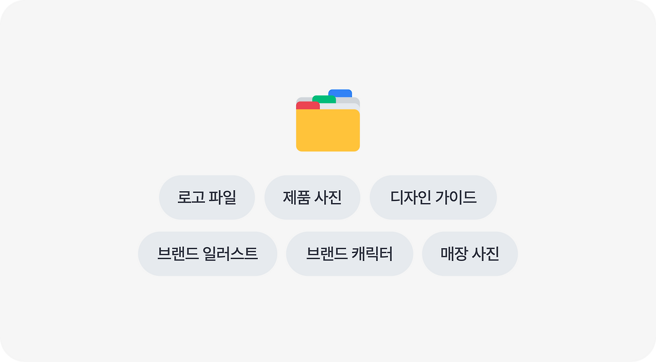 이렇게 요청사항을 잘 전달했지만, 디자이너에게 추가로 다른 것들을 더 전달할 수도 있습니다. 회사 혹은 브랜드가 보유하고 있는 디자인 에셋을 공유하면 작업물의 퀄리티가 확 올라갈 수 있어요. 여기서 디자인 에셋이란 로고 파일, 일러스트, 캐릭터, 제품 사진 등을 의미합니다. 만약 잘 갖춰진 BI, CI 문서가 있다면 일관성 있는 디자인을 위해 함께 공유해 주세요.