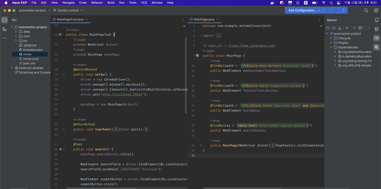 Aqua IDE에서 지원하는 Page Objects 자동 생성 템플릿 코드를 수정하거나 테스트 파일에서 UI 구조의 세부 정보가 나타나지 않도록 자동 생성된 mainPage 코드를 참고하여 PageObjects로 구현하면 좋을 것 같습니다.
