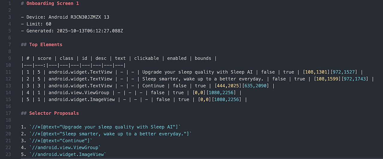 wdio 서비스 형태로 되어있어서 import 구문 없이도 browser.dumpLocators()처럼 편하게 사용 가능하고, 아래와 같이 해당 화면의 가장 최적화된 로케이터를 만들어준다. Score 기준은 자동화 분야에서의 Best Practice를 내 생각대로 반영한 것인데, 이것이 마음에 들지 않는다면 출력된 결과에서 입맛에 맞게 사용하면 된다. 핵심은 더 이상 Inspector를 실행하지 않아도 로케이터 설계에 필요한 UI 계층을 탐색하고 최적화된 로케이터를 WebdriverIO 문법으로 바로 활용 가능한 코드로 만들어준다는 것이다. 실제로 내가 실무에서 자동화 코드 구현 간에 활용하고 있으며 iOS 환경도 추가할 예정이다.
