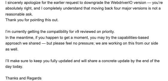 수년간 WebdriverIO를 활용하며 릴리스 노트를 트래킹 하고 있던 저로서는 납득이 안 가는 해결책이었습니다. WebdriverIO는 v8부터 동기식 → 비동기식으로 아키텍처가 완전히 변경되었고 당시 v9가 Stable 버전이므로 v5로의 회귀는 최신 WebdriverIO/Appium 생태계를 전혀 이해하지 못한 제안이라 판단되었습니다. 이로 인해 현시점에서 v5로의 마이그레이션은 최악의 선택이라며 기술적으로 강도 높은 비판을 했던 일이 있었습니다.
