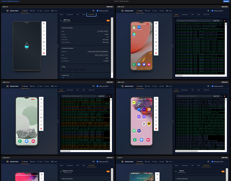 또한 디바이스팜 DB에 쌓이는 테스트 데이터들도 주기적으로 정리가 필요하며 메인 머신의 시스템 데이터가 너무 많이 쌓이게 되면 런타임 환경에서 Appium 실행이 중단되므로 이점 또한 고려해야 합니다. 그리고 메인 서버에 문제가 발생할 경우 서버 재부팅 혹은 메인 서버에서 실행되고 있는 여러 스크립트들 관리가 필요하므로 언제 어디서든 클라이언트 환경에서 메인 서버에 접근할 수 있도록 조치하는 작업이 필요합니다.
