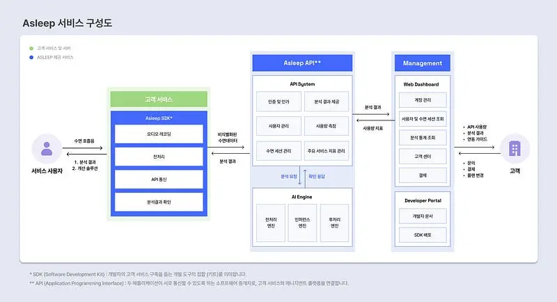SDK는 앱에서 API를 쉽게 활용할 수 있도록 스마트폰의 마이크를 통해 수집된 오디오 데이터를 자동으로 처리합니다. 이 과정에서 수집된 데이터를 분석 가능한 형태로 변환한 후 주기적으로 서버에 업로드합니다. SDK를 사용하면 클라이언트 앱에서 간단히 수면 측정 함수를 호출하는 것만으로도 수면 측정 기능을 구현할 수 있습니다.