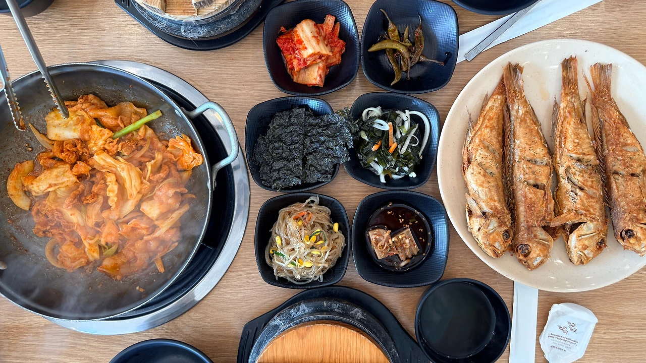 그런 우리에게 '통옥돔구이 한 상'은 그저 딱 좋은, 아주 잘 만난 밥상이었다. 가격도 아주 적당한 1인 16,000원. 퀄리티는 제대로! 튀기듯 구운 통옥돔 네 마리가 나오자마자 정신없이 허겁지겁 먹었다. 말그대로 겉바속촉이었다. 제육에 쓴 고기도 제대로 야들야들했다. 어느 반찬 하나 버릴 것없이 맛있었다.