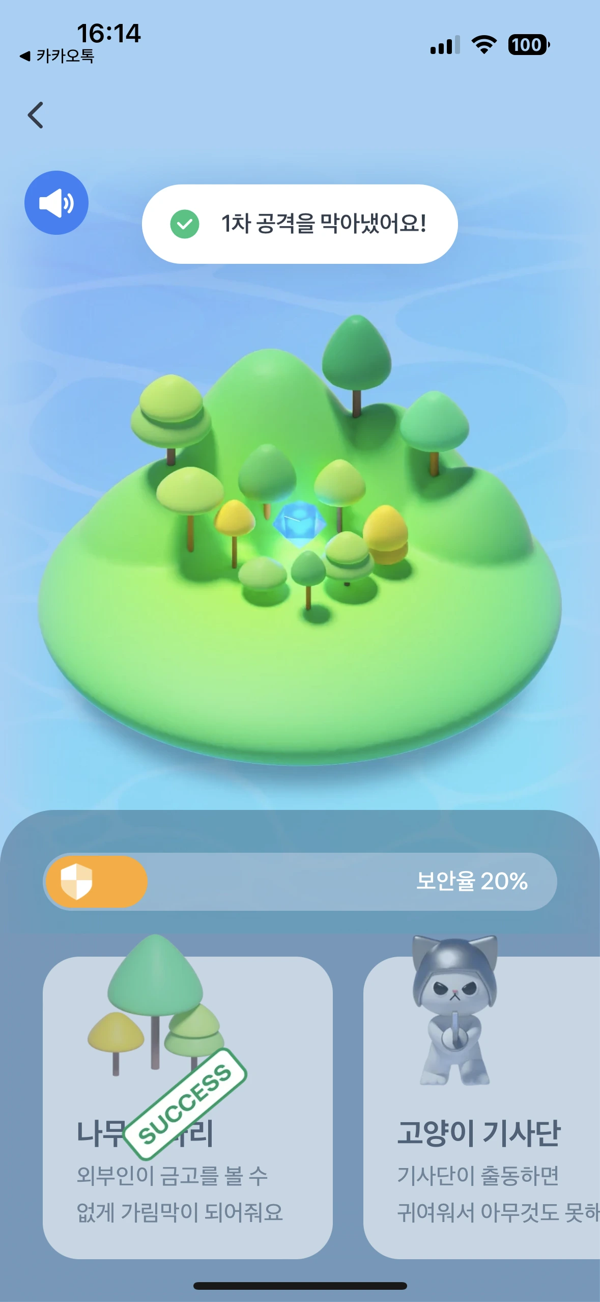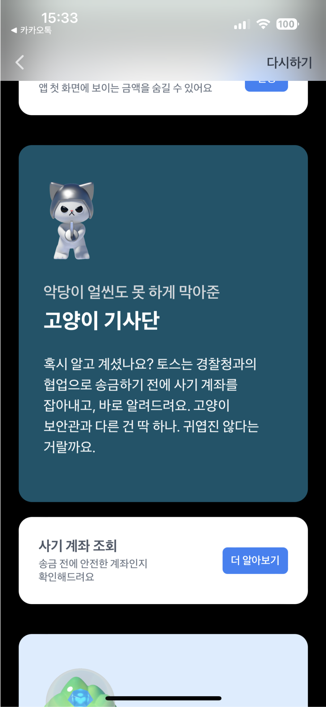 고양이 마을을 지키기 위해 클릭했던 세 가지가 모두 토스의 보안에 관한 서비스를 소개하기 위함이었다는 것을 알게 되었다. 또한 소개에서 그치지 않고 바로 그 화면에서 서비스를 사용해 볼 수 있도록 하는 것이 간편했다. 사실 해당 서비스를 사용하고 있지만 어떤 의도로 만들어졌는데 왜 사용해야 하는지 모르고 쓰는 경우가 더 많았는데 토스가 이런 서비스를 만들었는지 알 수 있게 되었다.