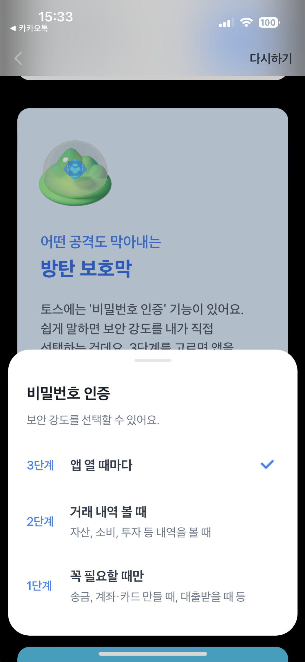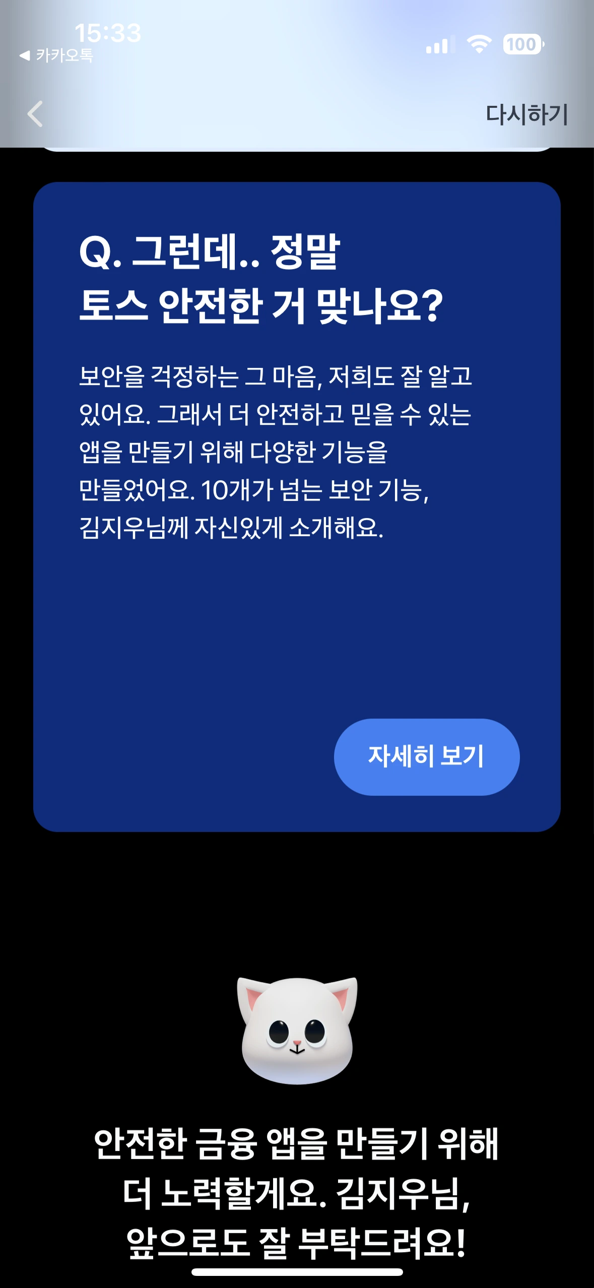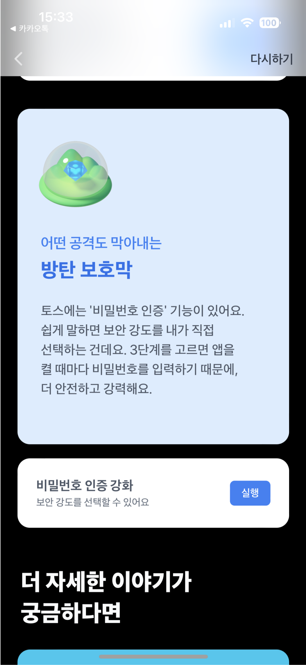토스를 통해서 금융서비스를 더욱 편리하게 사용하고 있지만 사용자들이 한 번쯤은 생각해 봤을 법한 것이 토스의 보안일 것이다. 나 또한 사용하면서도 쉽고 간편하게 사용해도 되는 건지, 그래도 금융서비스인데 보안이 철저한 게 맞는지 의문스러웠었다. 왜냐하면 기존 금융서비스들의 보이는 인증에 비하면 턱없이 짧은 뎁스 때문이었다. 근데 이렇게 직접적으로 유저들이 갖고 있는 의문점을 전달할 줄이야. 게다가 거기서 그치는 것이 아니라 보안에 관련된 서비스들을 소개해줘서 사용하지 않았던 것들도 한 번씩 사용해 볼 수 있도록 자연스럽게 유도하는 점이 거부감이 들지 않아서 좋았다.