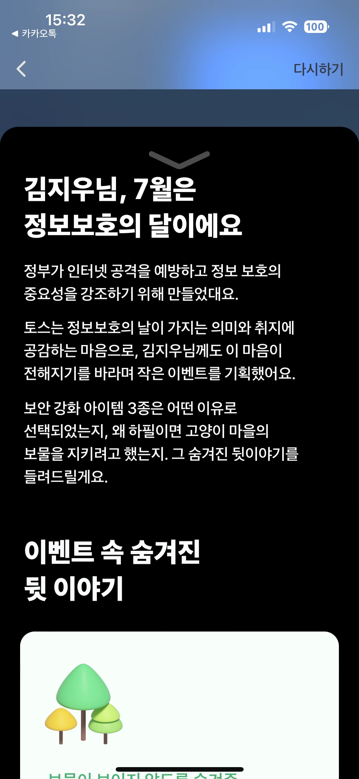 우리 서비스에 이런 게 있어요!라고 직접적으로 말하는 것이 아니라 자연스럽게 녹여내는 방법을 참 잘한다고 다시 한번 느끼게 된 토스의 정보보안의 날 이벤트!