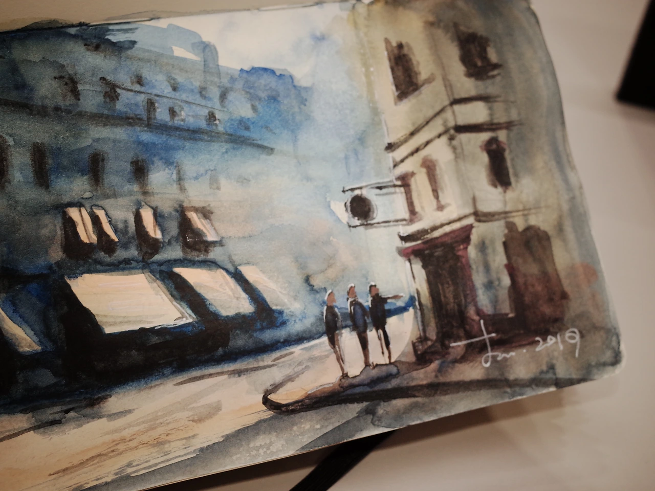 충동적으로 그림을 그릴때가 많은데, 어느날 수채화를 그리는 유튜브를 보다가 몰스킨을 흠뻑 적시며 그렸던 그림. 친구 셋이서 2차를 가는 그림이다.