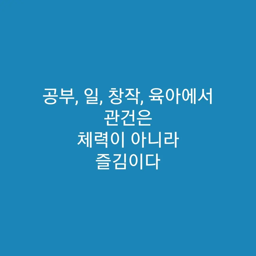 이건 심지어 육아도 마찬가지였다. 육아도 체력이라곤 하지만, 반복적으로 재미없는 육아를 오래 하기는 지옥처럼 견디기 힘든 일이다. 대신 육아에 창의성을 더하고, 함께할 수 있는 놀이, 함께 새로운 경험을 하는 방법들을 찾아내면, 육아도 놀이가 되었다. 그러면 알아서 몰입이 되고, 즐김이 되니, 체력은 문제되지 않는 순간들이 온다.