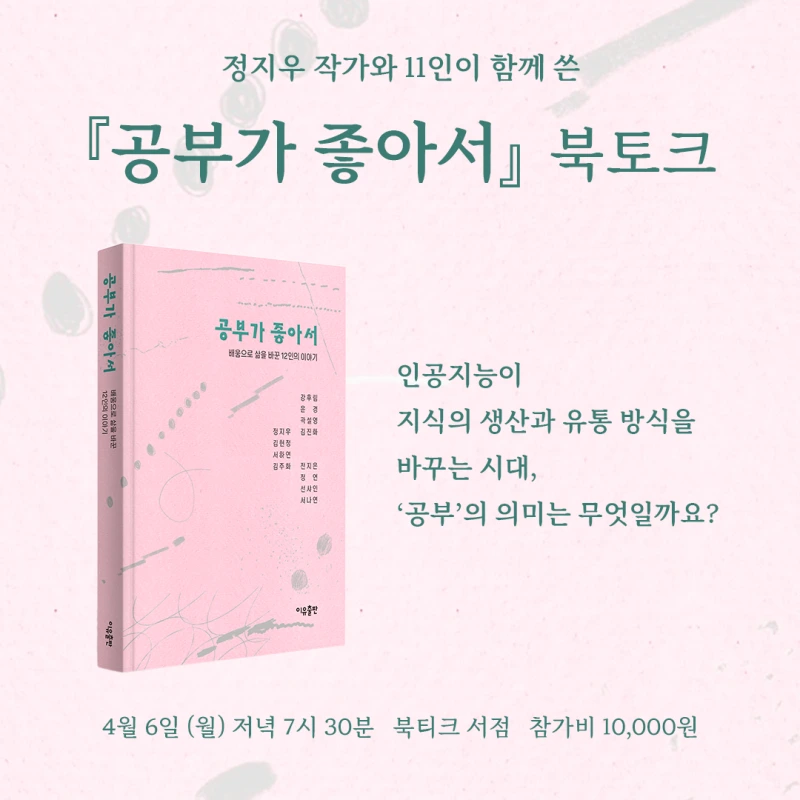 다음 주, 서울에서 2번의 북토크가 있습니다. 4/10 <오늘의 나를 쓰는 시간> 알라딘 북토크와 4/6 <공부가 좋아서> 북티크 북토크입니다. 각각 글쓰기와 공부를 주제로 하는, 뜻 깊은 시간이 될 거라 믿어 봅니다. :)
