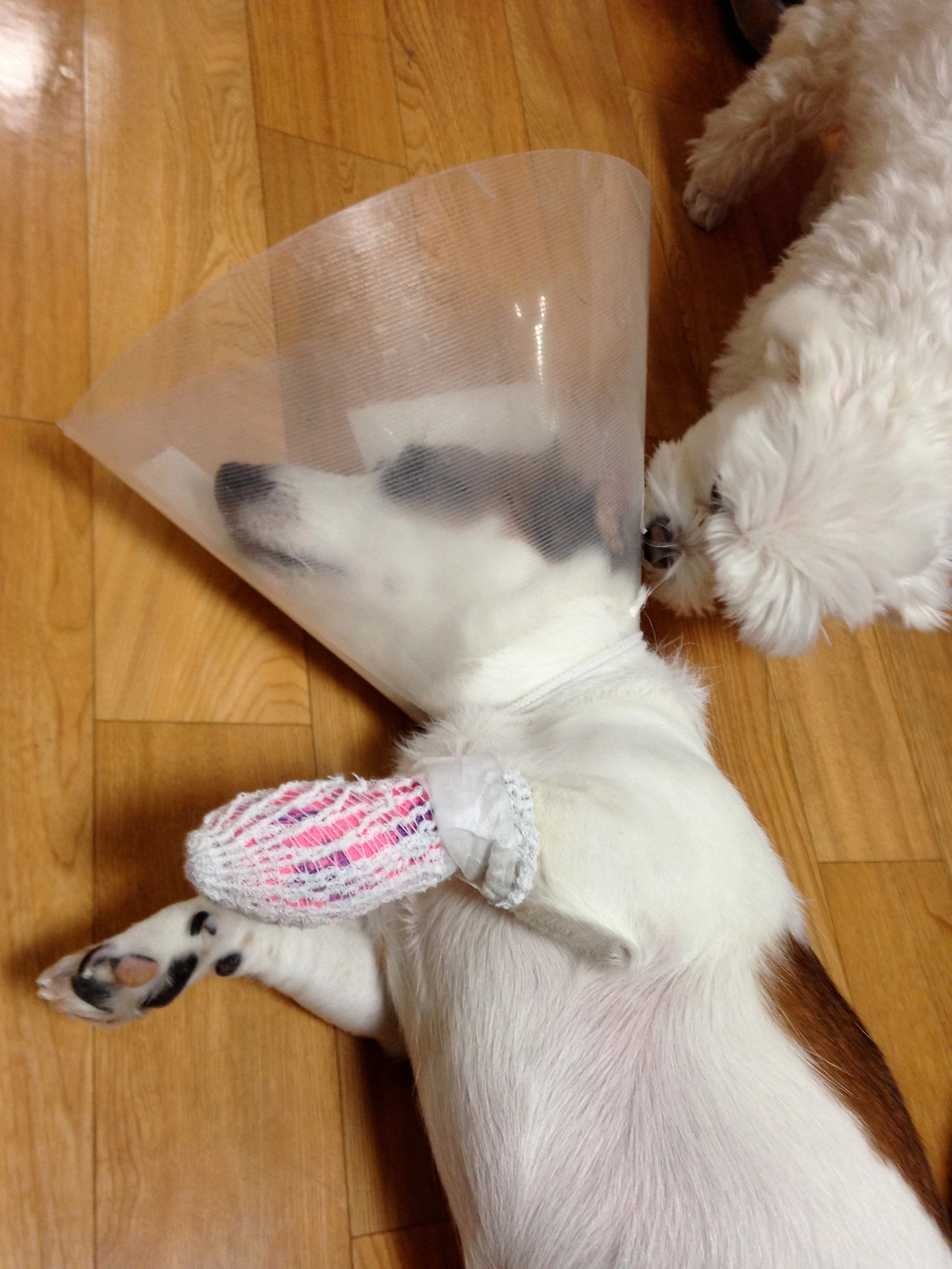 허리 디스크 수술로 인해 세 다리로 절뚝이며 걸어 다니는 상황이었기에, 그나마 몸을 지탱해주고 있는 작은 발가락들 중에 하나가 없어진다고 생각하니 마음이 착잡했다. 게다가 이제 나이가 더 들면서 몸에 하나, 둘 씩 종양이 더 생길 수 있다는 의사 선생님의 말에 마음의 무게는 더 무거워졌다. 부디 수술 후에도 노아가 잘 걸어 다니기를 바라며 다시 수술대에 노아를 맡기고 왔다.