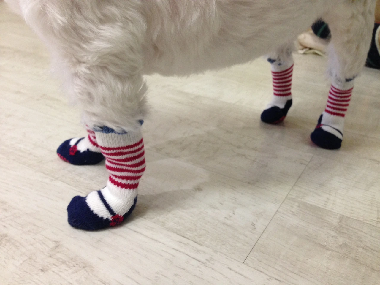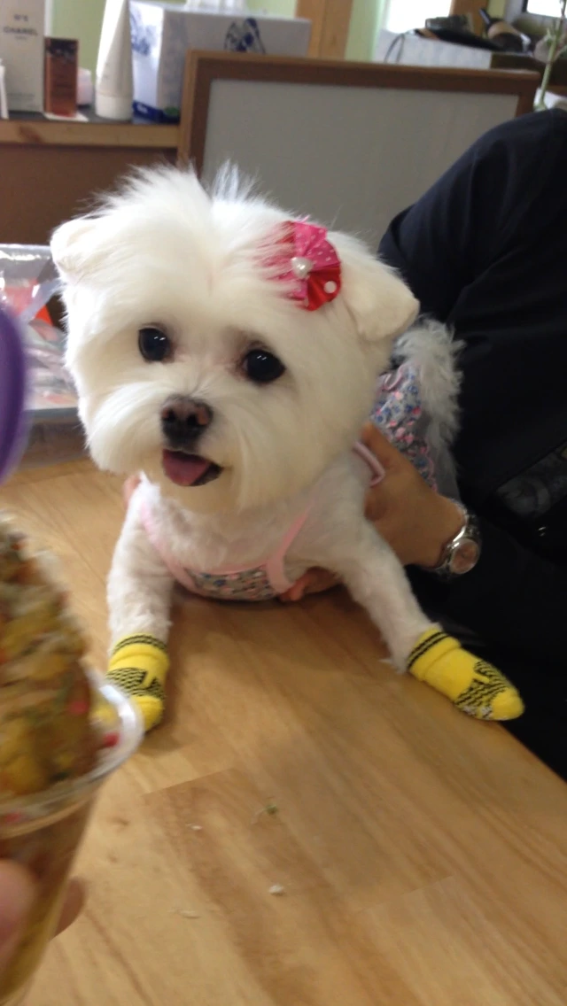 투비는 선물로 아주 귀여운 양말을 받았는데... 며칠 만에 본 투비의 새로운 미용이 나를 충격과 공포로 몰아넣었다... 얼굴의 털은 그대로인데 온 몸을 바짝 밀어 놔서 달걀귀신이 동동 떠다니는 모습을 본 것 같았다. 심지어 하얗고 큰 얼굴에 분홍색 꽃핀까지 서비스로 꽂아 주었는데, 꽃핀이 한층 더 투비의 광기스러운 모습을 부각했다. 지금까지도 여전히 무슨 이유로 그런 미용이 탄생했는지 이해가 잘 가지 않는다.