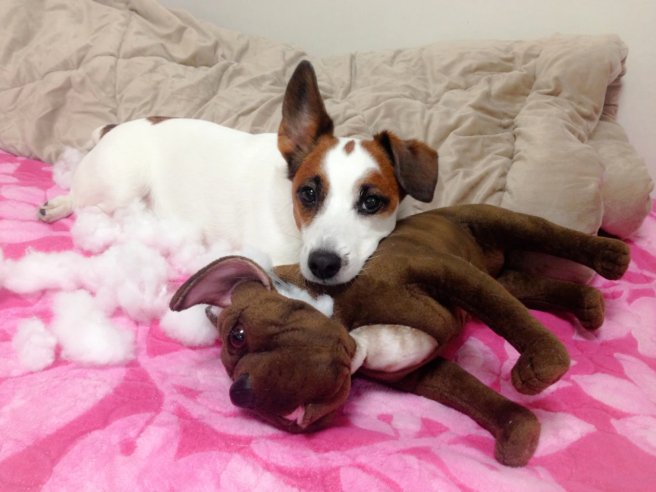 노아에게 장난감을 사주는 건 의미가 없었다. 특히 우리가 보기에 귀엽게 만들어진 장난감은 빠르면 몇 분 후, 늦어도 몇 시간 안에 아작이 났다. 노아에게 강아지 인형을 선물해준 적이 있었는데 조금 있다가 보니 인형은 내장이 터져 솜뭉치들이 침대 위에서 이리저리 나뒹굴고 있었고, 머리는 겨우 달랑달랑 붙어 있는 지경이었다... 아무리 세게 씹어도 모양이 변하지 않는 고강도 뼈다귀 정도 돼야 그나마 노아가 오래 가지고 놀 수 있었다.