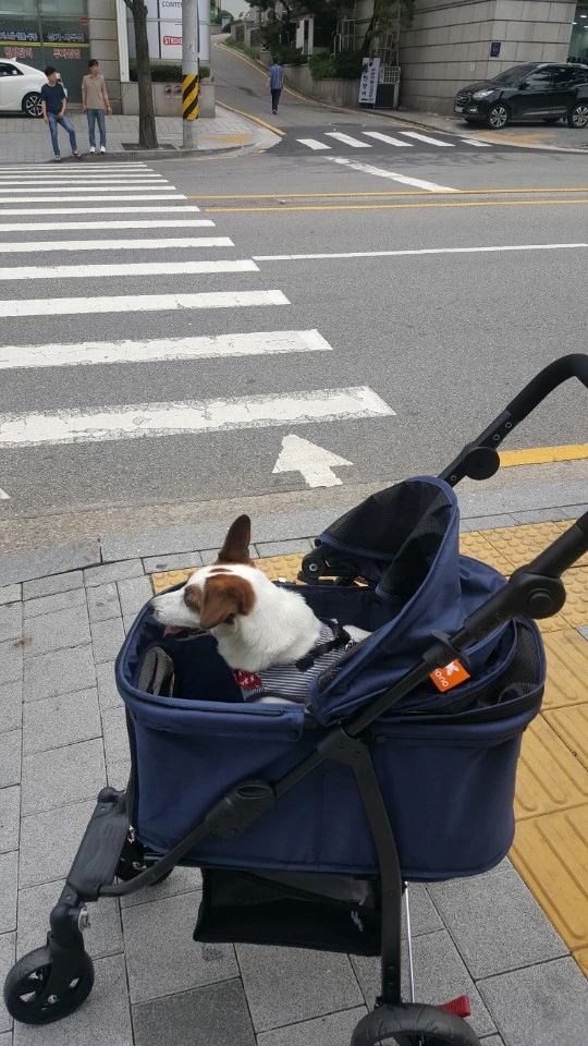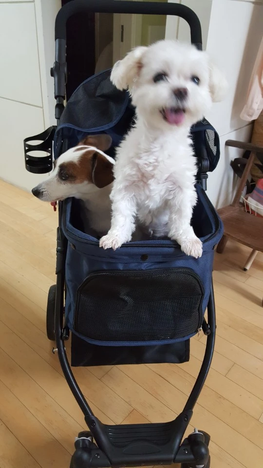 노아랑 투비 둘 다 산책이 힘든 건 아니었다. 다만, 안 그래도 한쪽 다리가 불편한 노아가 예전처럼 오랜 시간 동안 산책을 하기에는 힘들기 때문에 열심히 돈을 번 누나는 노아 앞에 유모차를 대령했다.