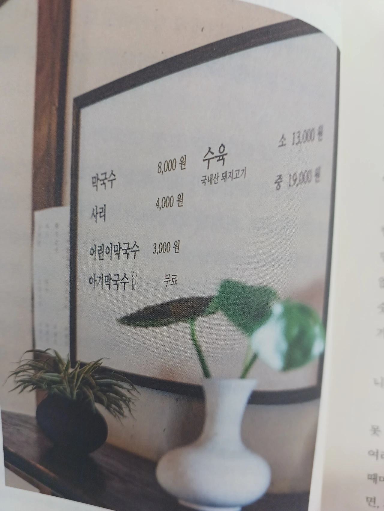 책에 나온 메뉴판 사진이라 지금이랑은 조금 다른 듯 하지만, 변하지 않은 것은 어린이 막국수와 아기 막국수 메뉴이다. 나는 그날 어린이나 아기와 방문하진 않았지만 메뉴판을 보니 사장님의 마음을 알 것 같았다.