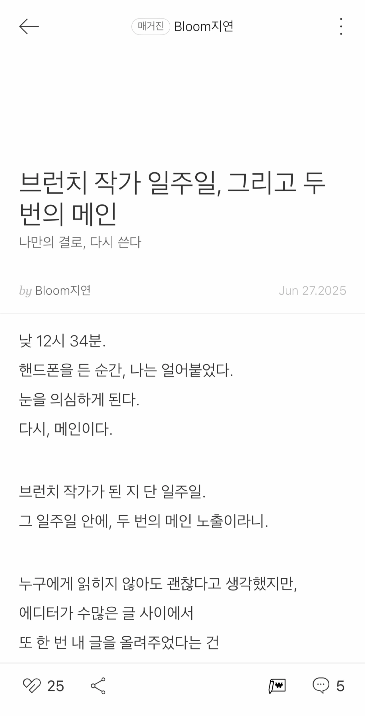 『브런치 작가 일주일, 그리고 두 번의 메인』