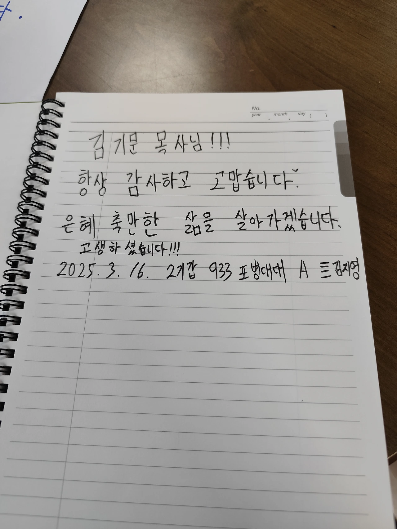 오랜만에 봤는데도 저를 축복해 주시고 제가 가는 길을 걱정을 해 주시는 목사님을 보면서 항상 은혜 충만한 삶을 살아가야겠다는 생각을 하였습니다.