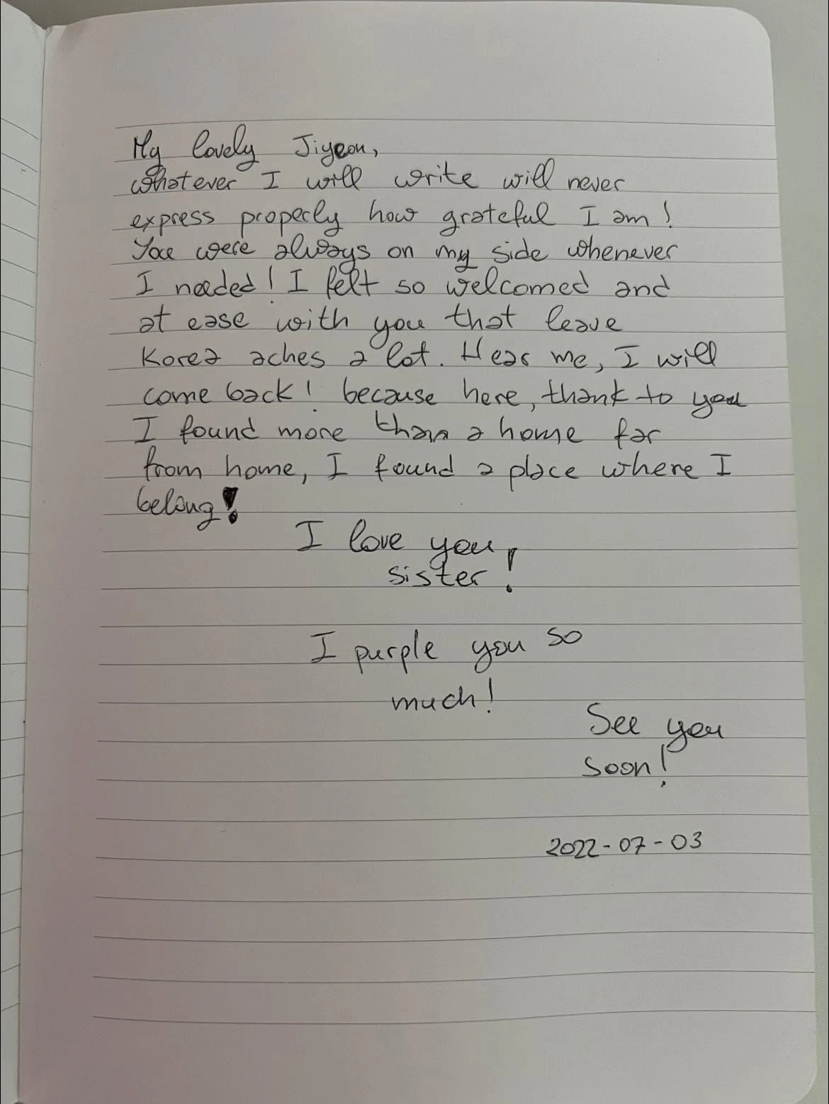 ps) 그나저나 그녀는 나에게 남준 편지를 안기고 갔다. 나중에 펴 보니 주소지도 없고 김남준 세 이름만 있다. 하… 틸드야.. 이걸 어디로 보내라는 거니…ㅠㅠㅠ ㅋㅋㅋ 마지막까지 미션을 주는구나…ㅠㅠ