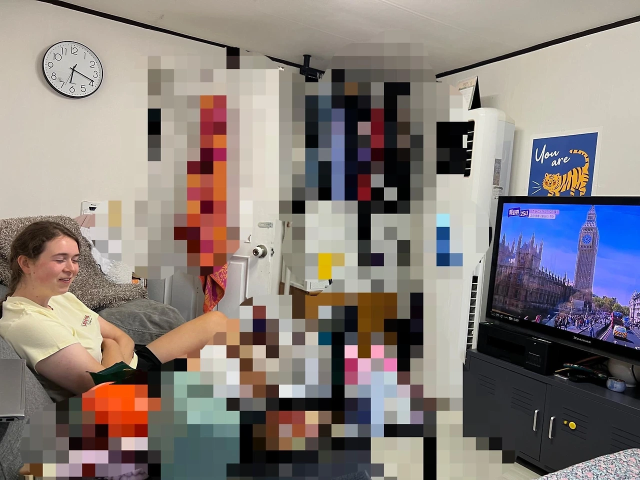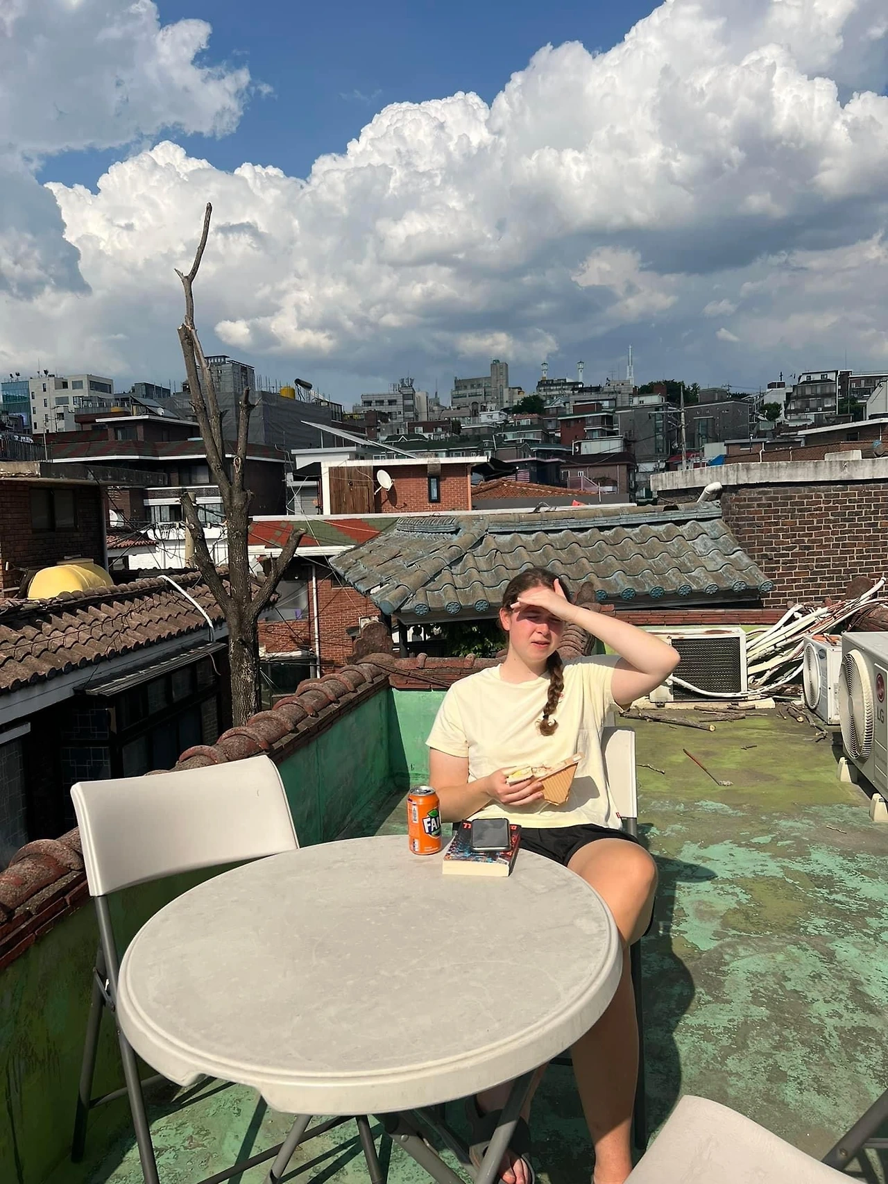 굳이 햇볕이 쏟아 지는 테라스에 나가 샌드위치를 먹는 걸 방에 데리고 들어와 함께 TV를 보며 수다를 떨었다(내 방에는 리틀하얏트 거실에 있던 대형 에어컨이 있다).
