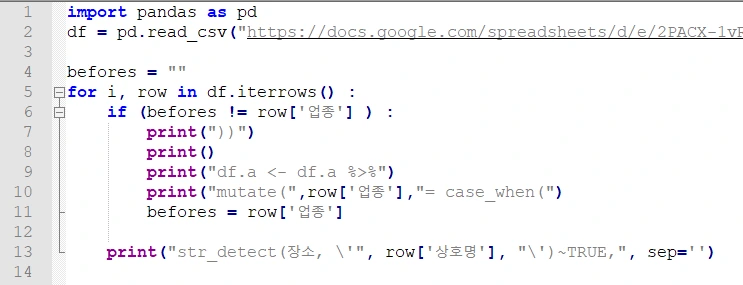여운 선배는 mutate랑 str_detect를 쓰면 된다는 힌트를 주셨다. 나는 R언어는 살짝 공부해봤으나 tidyverse라는 좋은 세계관은 인턴이 되고 나서야 알게 된 사람이었다. R 코드를 효율적으로 짜는 데에 부족함이 많았다. “한우”라는 단어가 있으면 업종 “고기”로 분류하는 코드를 계속 적었다. 키워드 하나하나씩 매칭하려면 비슷한 코드를 반복적으로 적어야 하니까 귀찮았다. 나는 당시에 R보다 python이 익숙해서, 스프레드시트에 키워드와 업종을 쭉 적고, ‘이 csv 데이터로 R코드를 짜주는’ python 코드를 짰다. 뭐… 대충 나의 잔머리를 총동원했다는 뜻이다.