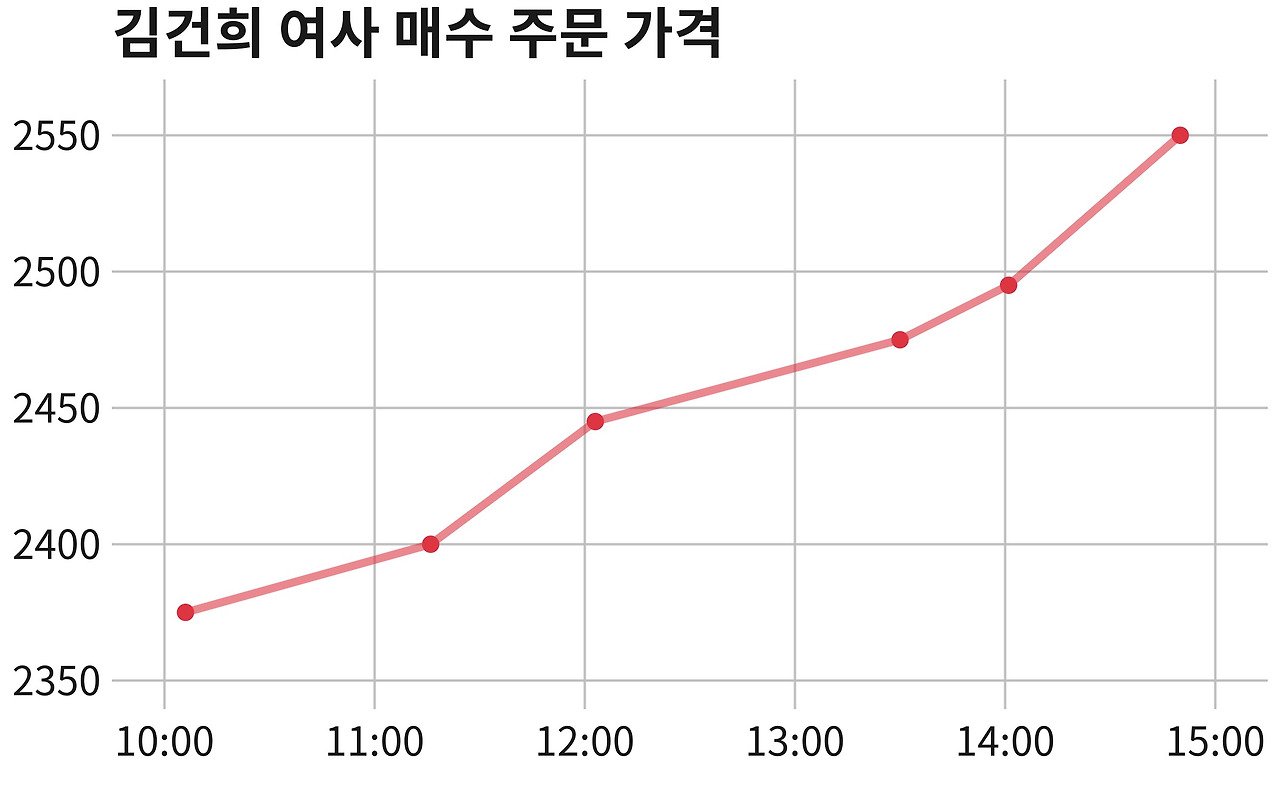기사를 작성한 인보 선배가 바쁜 일정들을 다 끝내신 후에, 드디어 연락이 닿았다. 위의 누적 막대 차트는 너무 좋은데, 위의 라인 그래프는 김건희가 매수 주문을 6번만 한 것처럼 보인다고 하셨다. 김건희는 실제로 도이치모터스 주식을 12일 하루 동안 80회 정도 구매했고, 인보 선배는 그래픽 의뢰할 때 주요 매수 시점 6회만 언급한 것이었다. 또한 위 그래프에서 마지막 주문 가격이 2,550원인데 도이치모터스 종가는 2,510원이라서 어색해 보이는 것은 주문 가격과 체결 가격의 차이 때문이었다.
