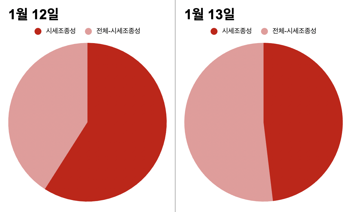 이렇게 파이 차트 두 개를 나란히 배치해서 만들 수도 있겠지만, 최선은 아니라고 생각했다. 우선 1월 12일에 김건희는 약 15만 주를, 13일에는 10만 주를 거래했다. 두 날짜의 거래량이 1.5배 차이 난다. 위의 모습처럼 파이 차트를 그리면 날짜별 거래량 차이를 보여줄 수 없다. 12일의 59%와 13일의 48%를 거래량 기준으로 비교하면 91,948주와 48,100주로 2배 가까이 차이가 난다. 날짜별 거래량의 차이와 시세조종성 거래의 비율을 동시에 보여줄 수 있는 방법이 있을까? 이번에도 누적 막대 차트를 활용했다. 더 좋은 방법이 있을 수도 있지만, 내가 이때 생각한 최선은 누적 막대 차트였다.