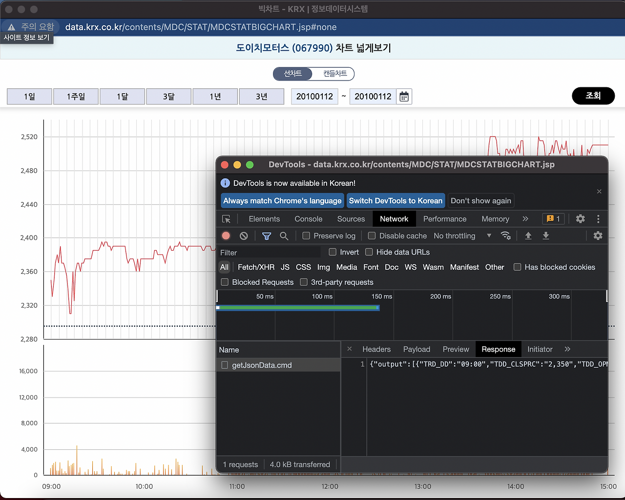 [한국거래소 > 정보데이터시스템]에서 '도이치모터스'를 검색하고, [빅차트]를 클릭해서 2010년 1월 12일 일자의 주가를 조회했다.