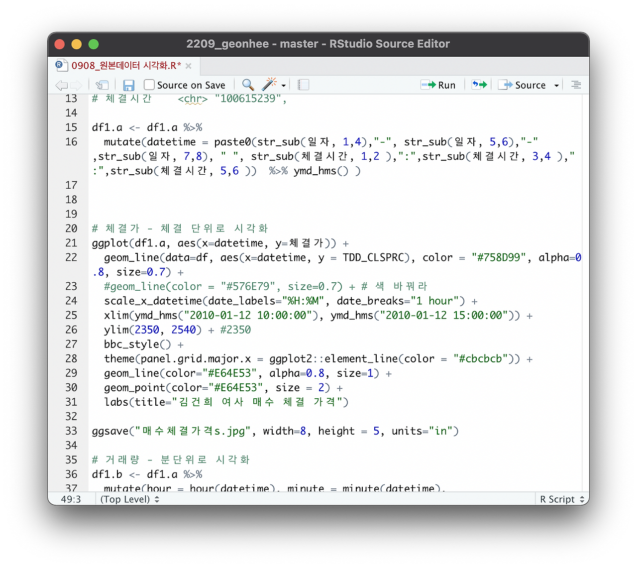 나란히 배치하긴 했지만 시간 단위는 살짝 달랐다. 예를 들어 주식 매수는 10시 6분 15초와 10시 6분 58초 등 초단위로 다른 거래가 체결됐다. 매수 체결을 시각화할 때는 초단위로 점을 찍었다. 반면에 거래량도 막대를 그리게 되면 막대가 너무 가늘어져서 그래프를 읽기 어려워질 것 같았다. 따라서 거래량은 분단위로 데이터를 정리해서 시각화했다. 2개의 그래프는 ggplot의 ggsave 함수를 이용해서 필요한 크기로 설정해서 출력하니, 일러스트레이터에서 마무리 작업을 수월하게 할 수 있었다.