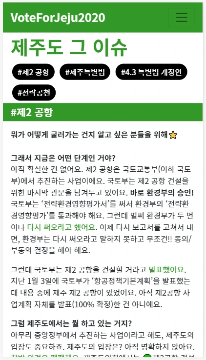 vote for jeju 사이트에는 지역구 별 후보자의 공약과 관련 기사 정보, 그리고 비례대표 정보를 정리한 사이트 링크가 담겨 있다. ‘제주도 그 이슈’ 페이지에는 도내 현안을 최대한 쉽게 직접 정리해봤다. 정보를 수집하는 단계에서는 후보자 정보를 모두 정리하는 것이 품이 많이 들어서 힘들었지만, 기획 단계에서 힘들었던 부분은 비례대표 파트이다.