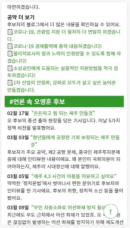 중립을 지키면서 정리하는 게 어려웠다. 구체적으로 말하자면, 터무니없는 공약을 깔끔하게 정리해주기 힘들었다. 제주도의 자연환경을 아끼는 사람으로서, 양길현 예비후보의 한라산 케이블카 공약과 해안가 트램 설치 공약을 '평온한 톤으로' 정리하기 어려웠다. (애써 정리했는데 불출마 선언하셔서 그동안 정리한 게 아까워서 짜증 났고, 앞으로 더 정리하지 않아도 되니 기뻤다.) 하지만 정리하는 것도 점점 익숙해져서 문대탄 후보의 '4.3 사건은 남로당 공산 폭동이다'라는 발언을 덤덤하게 정리할 수 있었다^^.
