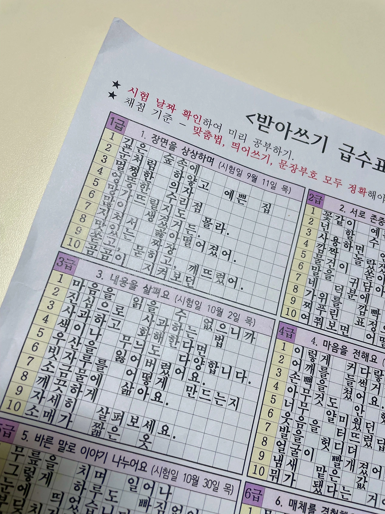 2주에 한 번 치르는 받아쓰기. 날짜가 적힌 용지도 있고, 선생님도 여러 번 알림장을 통해 알려주시는데, 이번에도 결국 또 놓치고 말았다. 오늘 아침이 되어서야 시험날이라는 사실을 떠올렸다. 이미 늦었다는 걸 알면서도 마음이 다급해졌다.