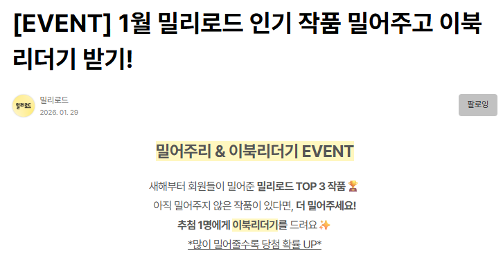 밀리의 서재에서 1월의 밀어주기 인기 작품을 통해 이북리더기를 제공하는 이벤트를 함께 진행하고 있습니다. 그래서 처음으로 용기를 내어 브런치에도 제 연재글을 소개하게 되었어요. 밀어주기만으로도 이벤트 참여가 되거든요.