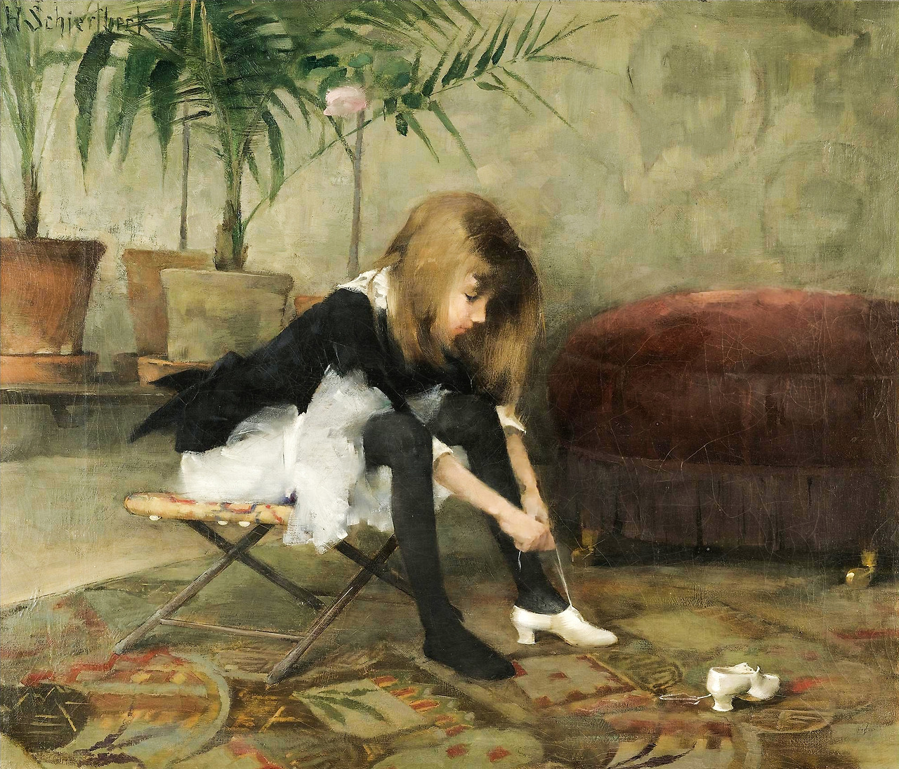 소녀의 발 앞에는 새하얀 무도화 한 켤레가 놓여 있습니다.