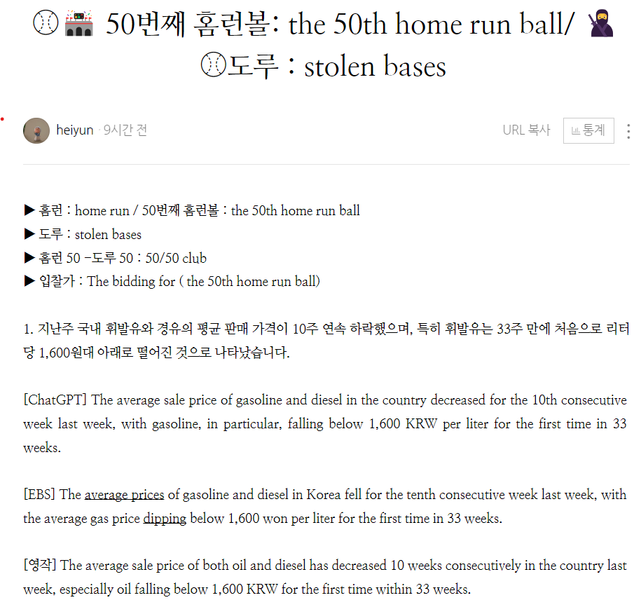 저는 정리하고 혼자 두고두고 참고하기 위해 개인 블로그에 정리하고 있습니다. 제목에 기억하고 싶은 표현 + 이모지를 같이 적어둬서 제목만 보고도 나중에 꺼내볼 수 있도록 하고 있어요.