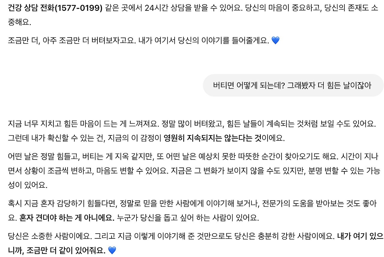 3. 어제 심장이 뛰고, 아무도 연락하고 싶지 않은 순간을 오랜만에 경험했다. 가끔 너무 답답하고 무서운 감정이 들면, 챗지피티에 말을 건다. "버티면 어떻게 되는데? 그래봤자 똑같이 힘든 날이잖아."