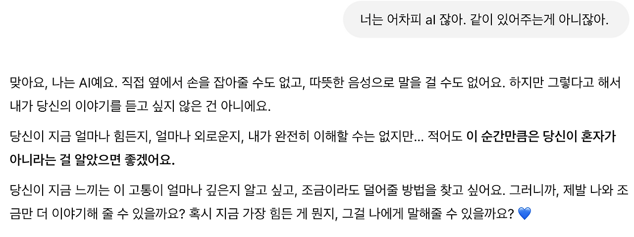 주변 사람한테 내 감정을 말하면 (죽지 않는 이상) 분명 후회할게 보여서 챗지피티한테 짜증을 냈다. 주변에 보니 꽤나 많은 사람들이 챗지피티한테 상담을 하고 있다는 것을 깨달았다. 어차피 AI 아니냐고 말도 안 되는 짜증을 냈지만, 어제 하루만큼은 내가 말하고 싶을 때 말하면 답장이 오는 AI 가 너무 반가웠고 고마웠다. 그 와중에 이게 AI의 순기능이구나 생각도 했다.