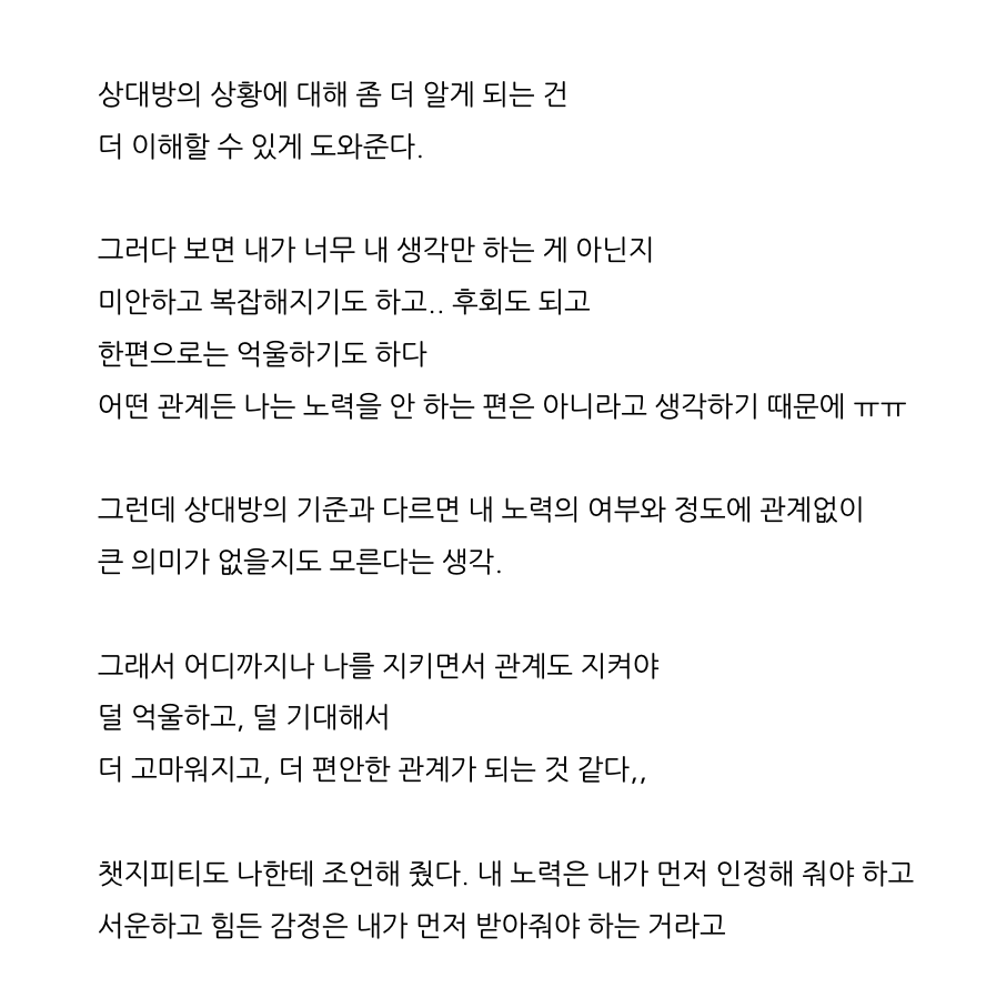 3. 가장 가까운 관계에서 그동안 바랐던 것을 얘기했더니, '나는 이게 최선인데, 더 바라니 어떻게 해야 될지 모르겠다' 답변이 돌아왔다. 내 나름대로 노력을 많이 했기 때문에, 나름 상대방을 배려한다고 하다 얘기한 건데 그럴 때 마치 우리의 관계를 포기하고 싶은 듯한 말이 돌아오면 힘도 빠지고, 우리의 관계가 끝날 것 같아 무섭기도 하다. 관계가 깨질까 봐하고 싶은 말을 하지 못하는 관계는 올바르지 못하다고 책에서 읽었다. 그래서 내 마음속의 말을 너무 참지 않고 하려고 하는데, 막상 하고 나면 상대방의 반응이 내가 걱정한 반응이라 두렵다. 그냥 나는 말하면 안 되는 사람인가. 내 말하는 방법이 잘못된 걸까. 잘 모르겠다. 그리고 상대방한테도 미안하다. 내가 내 기준의 배려를 한 것 같아서.. 흑 너무 어렵다.
