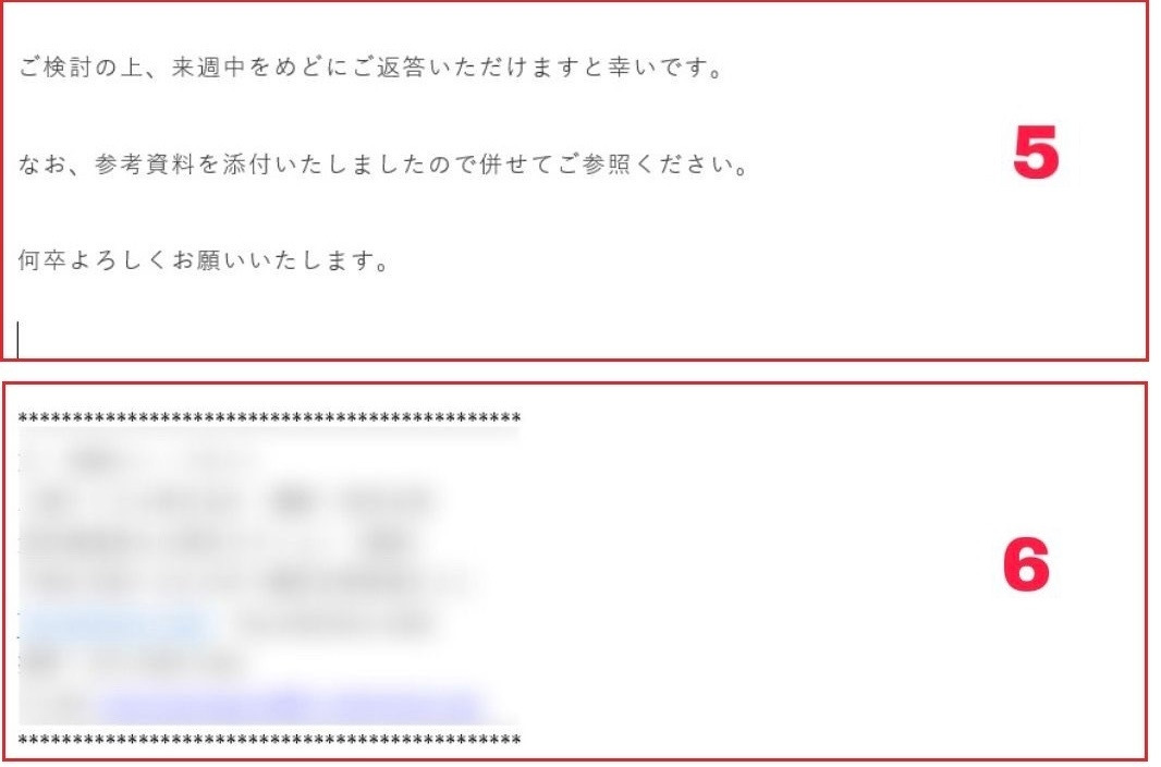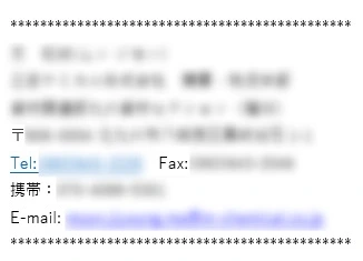 일반적으로 메일의 끝부분에 발신자의 정보를 기록한 서명을 넣는다. 메일 소프트웨어에 서명을 등록하는 기능이 있다. 편리하므로 꼭 이용해보자. 사외용 서명에는 일반적으로 회사명, 부서명, 이름, 회사 주소, 전화, 팩스 번호, 메일 주소, 회사 URL 등이 들어간다.