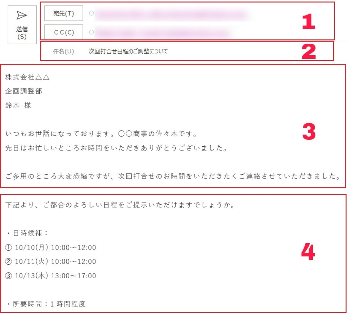 ・ 키워드 넣기 : 회의에 대한 메일이라면 [회의 이름], [제○회 회의], [회의 연기] 등의 말을 넣으면 알기 쉽다.