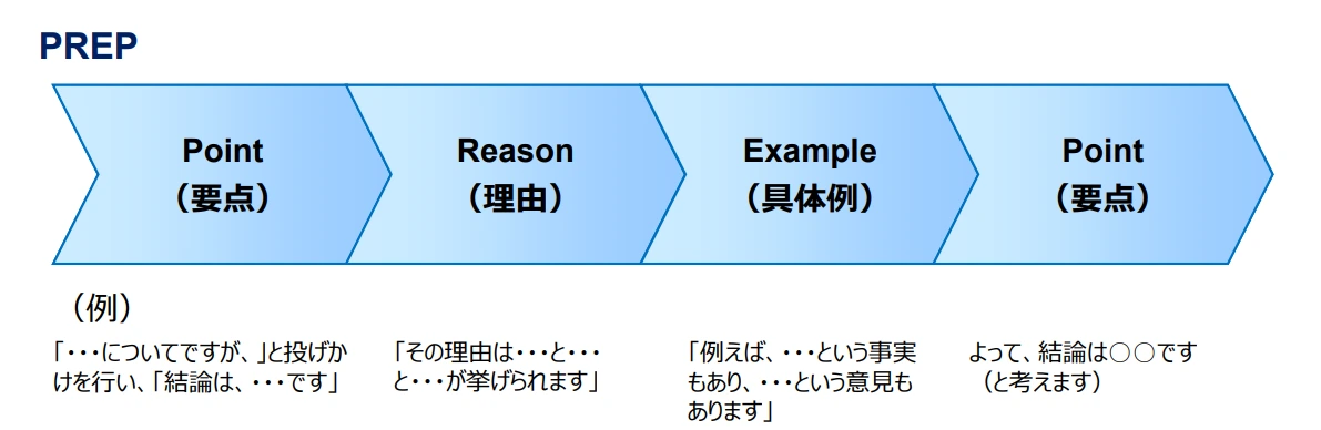 PREP : 처음에 요점(결론, 주장)을 전하면서 결론에 이른 이유를 설명하고, 이유로 설득력을 키우는 사례나 데이터를 제시한 후, 마지막으로 다시 요점을 언급하는 구성 방식