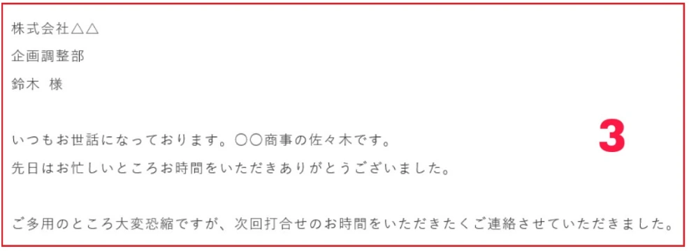 본론 앞에 인사말을 한 마디 정도 쓰는 것이 매너이다. 보통 거래처에 메일을 보낼 때에는 いつもお世話になっております(항상 신세 지고 있습니다)를, 사내 사람에게 메일을 보낼 때에는 お疲れ様です(수고하십니다)를 가장 많이 쓴다.