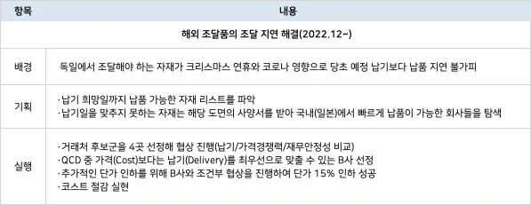 외자구매의 경우 통상 코스트 삭감률이 3.5%이라 당초 목표를 4% 삭감으로 잡았는데, 목표치를 웃도는 6.6% 삭감을 달성했다.
