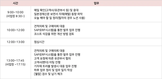 또 업무 시간 중에는 제품 선적상황 등을 확인하거나, 사내 유관부서와 생산 일정을 확인하고 소요량과 입고 일정을 점검하는 데 많은 시간을 할애하고 있다. 한편 매주 수요일에 있는 부서 정례회의에서는 분기별 수급 계획, 중장기 전략에 대해 논의하며 내부 보고를 준비하는 경우도 있다.