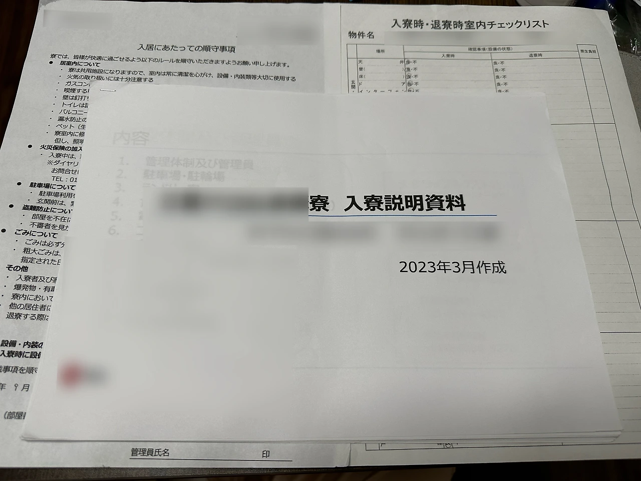 새로운 집에 대한 간단한 설명을 듣고 방 체크리스트를 작성해 제출해야 한다. 이때 집 열쇠도 받았다.(일본은 아직까지도 도어락보다 열쇠를 쓰는 집이 많다.) 기숙사 관리인 분께 기숙사 설명자료, 방 체크리스트(入寮時・退寮時室内チェックリスト) 종이를 받으면, 입주 전에 내 방에 문제가 없는지 확인해 각각의 항목에 대한 良/不를 체크해서 제출한다. 이 종이는 퇴거할 때도 작성해야 하는데 퇴거 시 물건 등에 문제가 생길 경우 보수비용을 지불해야 한다.