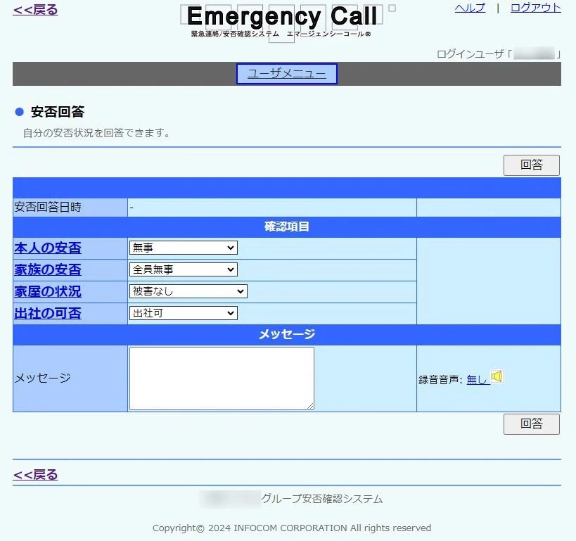 매년 실시되는 사내 BCP 훈련에서는 훈련 당일 재난 경보음이 전 회사에 울리면 가장 먼저 안위확인 회답을 모의 실시함으로써 자연재해나 긴급사태가 발생했을 때 연락을 취할 수 있는지를 체크한다.